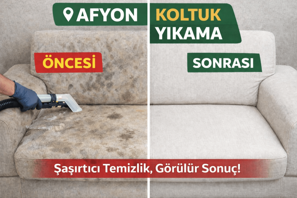 Afyon Koltuk Yıkama olarak Afyonkarahisar merkezde yerinde koltuk yıkama, çekyat yıkama, yatak yıkama ve araç koltuğu yıkama hizmeti sunuyoruz. Profesyonel ekipman, hijyenik temizlik ve uygun fiyatlarla Afyon’da koltuk yıkama denince tercih edilen firmayız.
